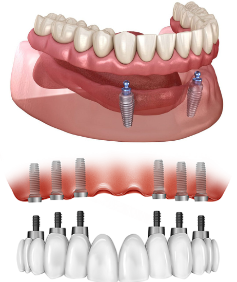 An implant-supported complete denture is a type of overdenture that is supported by and attached to dental implants. It is used when all teeth are missing in the oral cavity, providing improved stability, function, and comfort compared to traditional dentures. Implants are surgically placed in the jawbone, serving as anchors for the denture, which can be removable or fixed. This solution helps preserve bone density, enhance chewing efficiency, and improve overall oral health and quality of life.